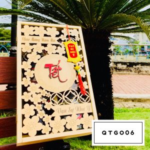 - 1 hộp gỗ cắt CNC chữ Tết và họa tiết hoa đào tinh xảo với màu sắc gỗ nguyên bản cực kì sang trọng